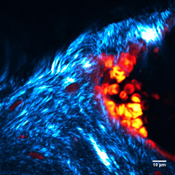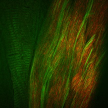 Mit der Second Harmonic Generation als Kontrastmechanismus lassen sich besonders gut Kollagen-oder Muskelfasern abbilden, die z.B. häufig in Knorpelgewebe vorkommen.